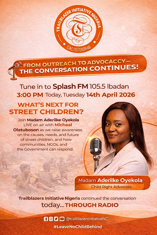 As a follow-up to our successful commemoration of the International Day for Street Children, we invite you to join the conversation today. Tune in to Splash FM 105.5 Ibadan by 3:00 PM this Tuesday, 14th April 2026, as Madam Aderiike Oyekola joins Micheal Olatuboson live on air to shed more light on the realities of...