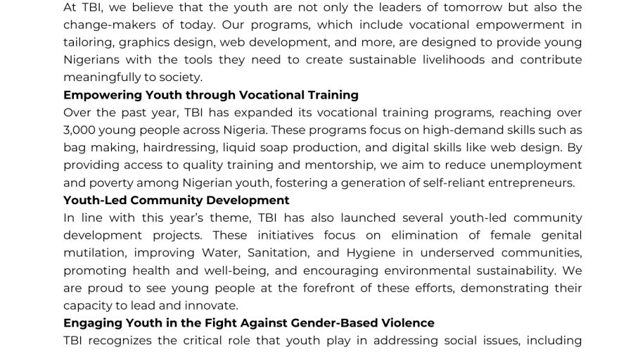 Empowering Youth for a Sustainable Future Ibadan, Nigeria – August 12, 2024: As the world celebrates International Youth Day 2024, Trailblazer Initiative Nigeria (TBI) reaffirms its commitment to empowering Nigerian...