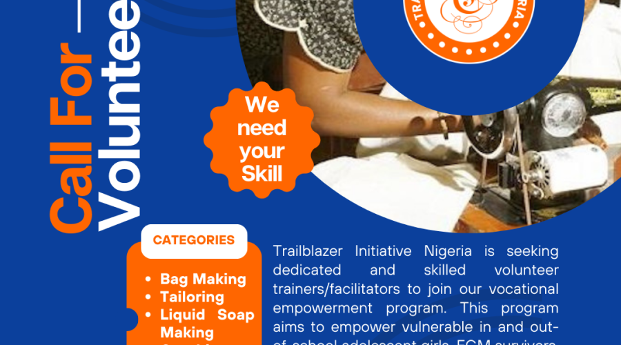 Trailblazer Initiative Nigeria is seeking dedicated and skilled volunteer trainers/facilitators to join our free vocational empowerment program. This program aims to empower vulnerable 40 in and out-of-school adolescent girls, Female...