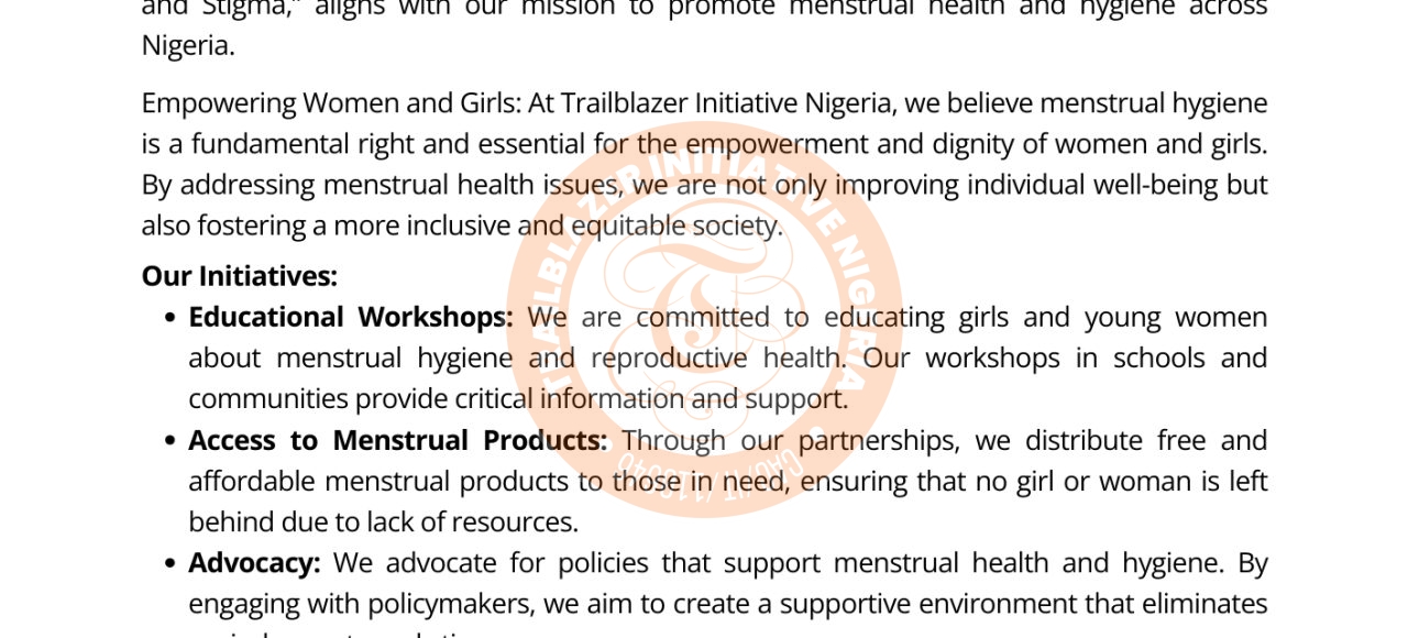 Ibadan, Nigeria – May 28, 2024 Executive Director’s Statement on World Menstrual Hygiene Day Today, Trailblazer Initiative Nigeria proudly joins the global community in commemorating World Menstrual Hygiene Day. This year’s theme, “Creating a World Without Period Poverty and Stigma,”...Read More