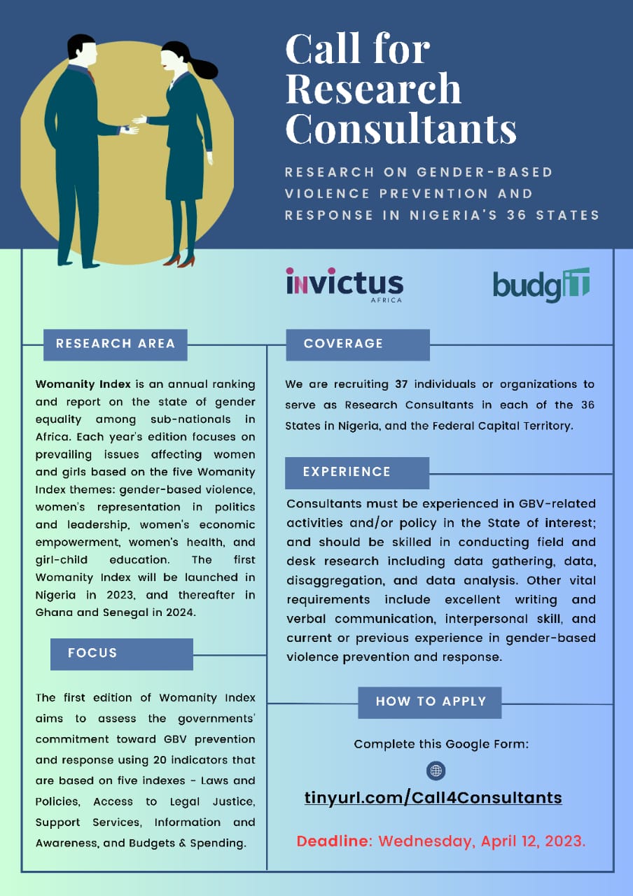 Invictus Africa and BudgIT Foundation are calling for 37 Research Consultants in the 36 States of Nigeria, and the FCT.