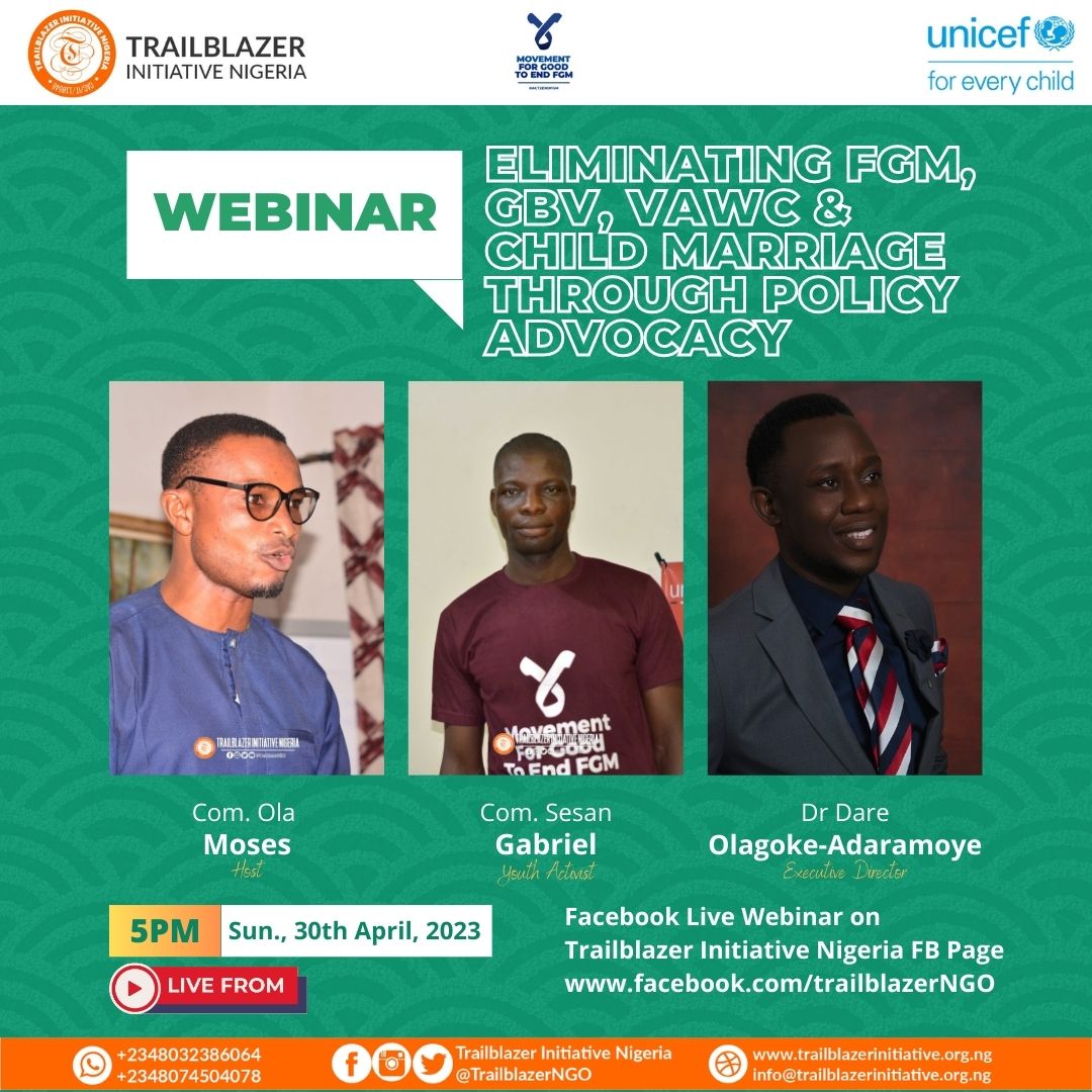 We invite you to join for yet another exicting time of learn on Sunday 30th April, 2023 by 5pm as we X-ray the topic; “Eliminating Female Genital Mutilation, Gender-Based Violence, Violence against Women and Children, and Child Marriage through Policy Advocacy”.